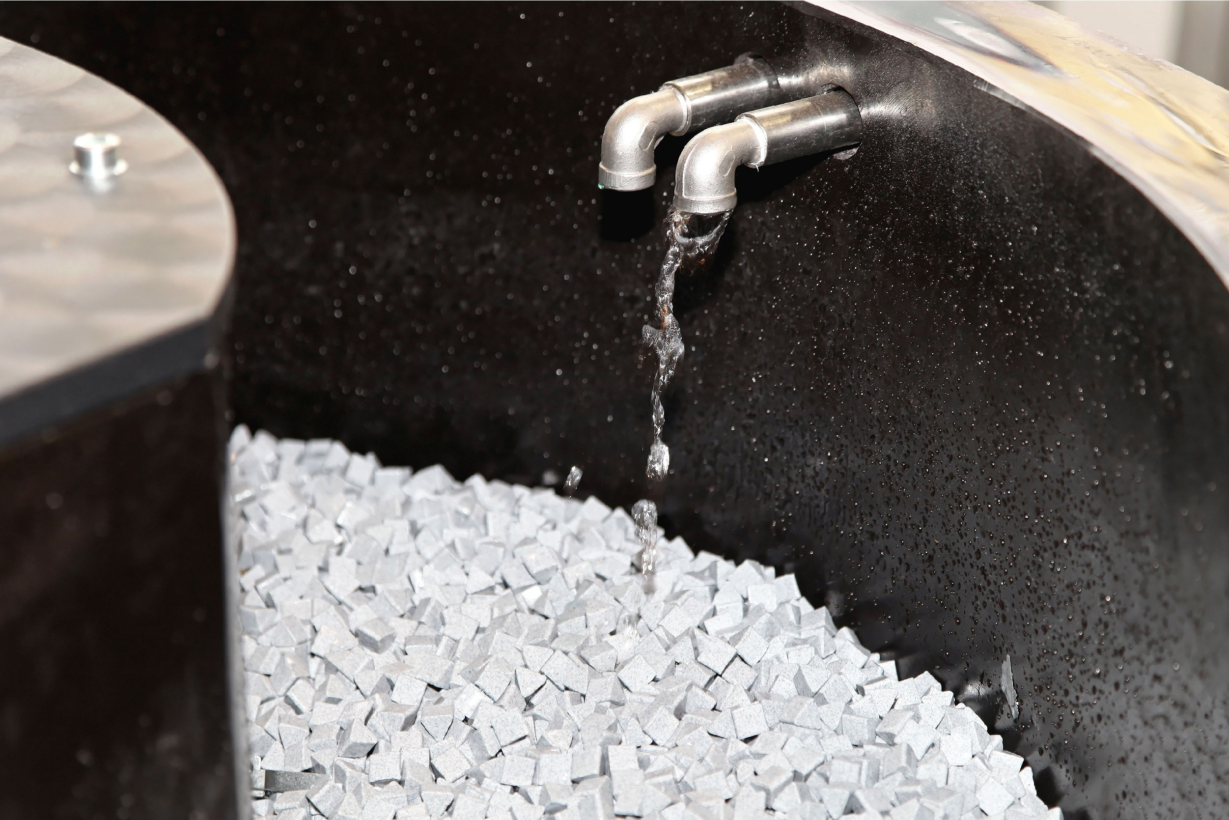 Mass finishing is a process that automates the mechanical and chemical finishing of parts. The benefits of this stage in the manufacturing process of components are cost and time savings, as it allows large numbers of parts to be finished simultaneously.